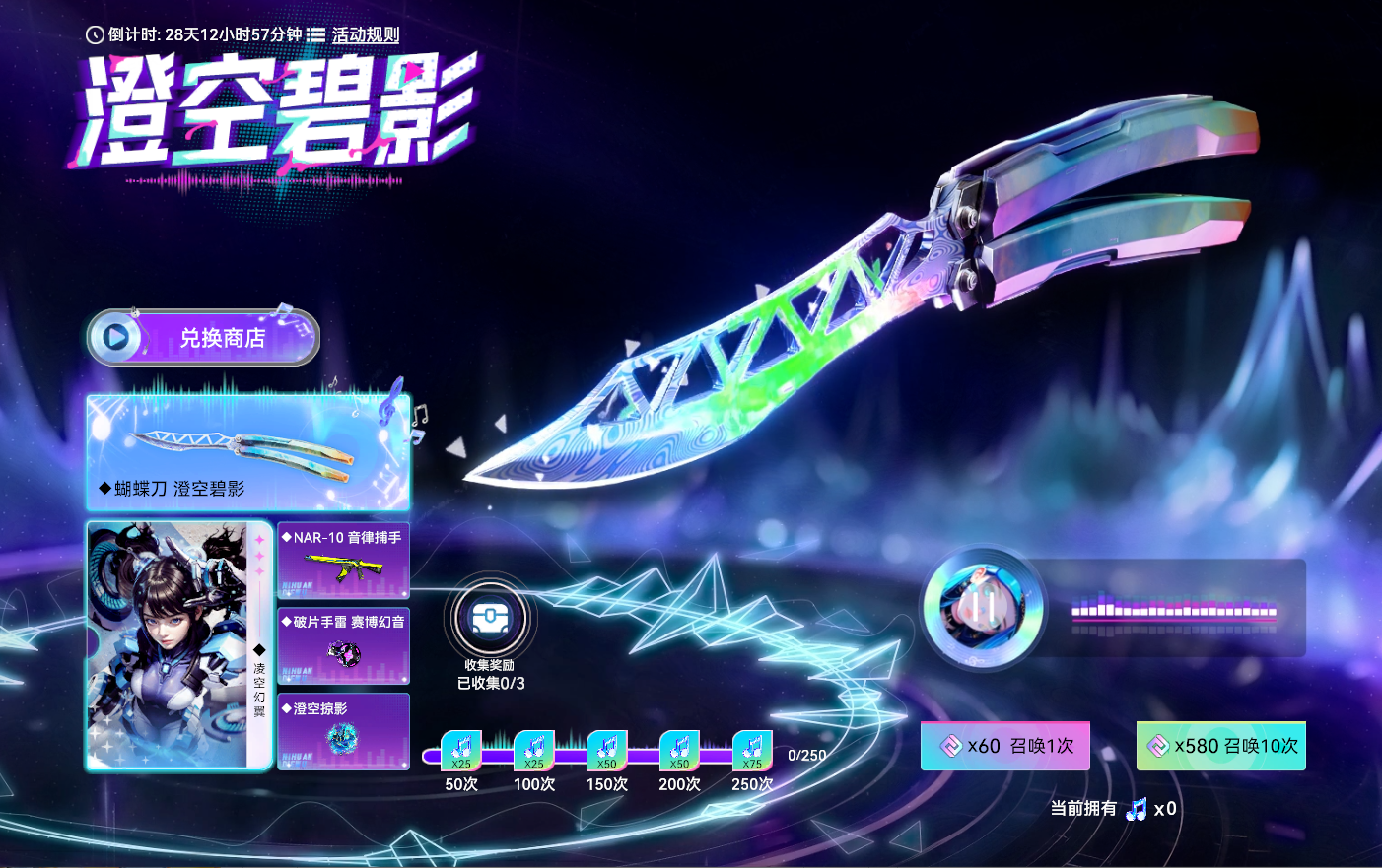◆收集奖励:当同时拥有蝴蝶刀 澄空碧影,人类英雄 凌空幻翼,传奇武器 NAR-10 音律捕手,可获得动态头像与静态头像框澄空掠影,如果已持有该头像与头像框的无法重复获得,本次将会获得240金币