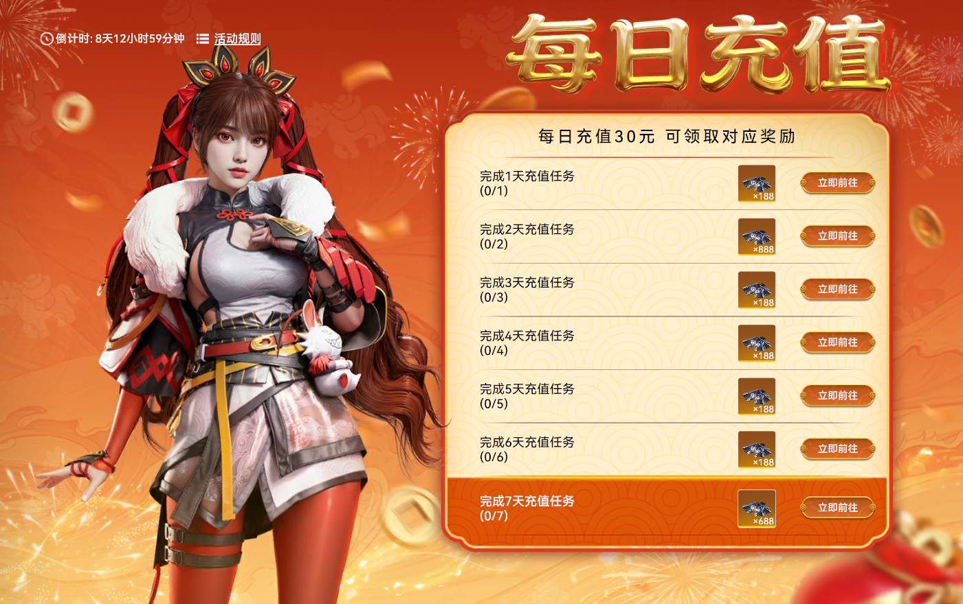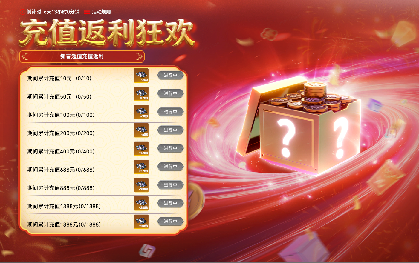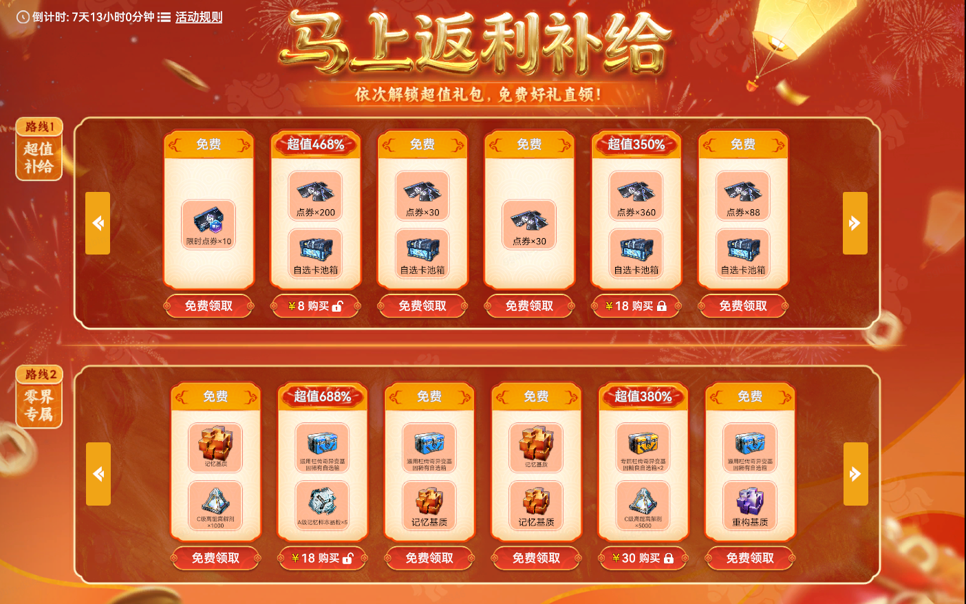 ◆活动期间,在本活动页面,依次解锁对应礼包,可获取对应奖励。每个礼包按顺序依次解锁后,仅可领取一次奖励