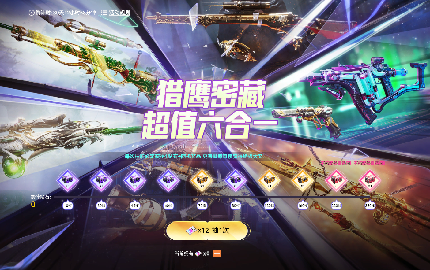 ◆活动期间,累计钻石达到对应数量可在活动内领取里程碑奖励。钻石用于猎鹰秘藏六合一活动,过期后无效,返场活动不可重复使用