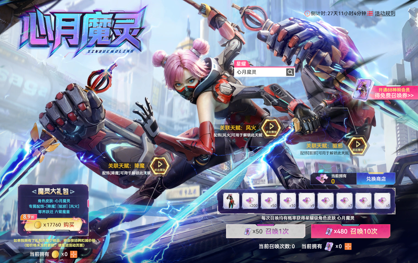 ◆活动期间,可花费吉吉币*17760购买魔灵大礼(限购1次),内含:星耀角色皮肤 心月魔灵;零界跃迁 六臂魔童;配饰:降魔+驱邪+风火