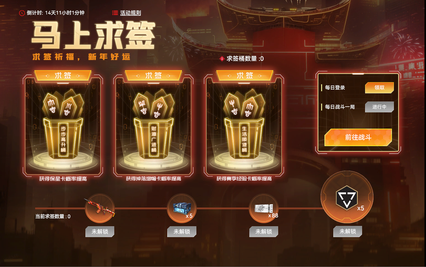 ◆每日登录游戏可获得求签桶×1,每日战斗1场可获得求签桶×1